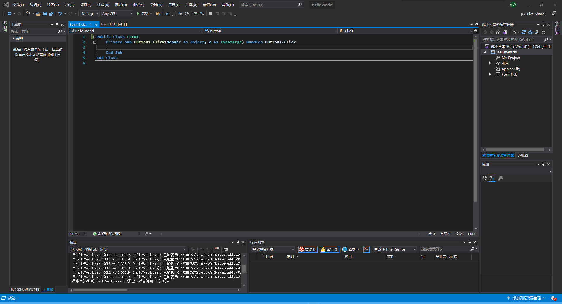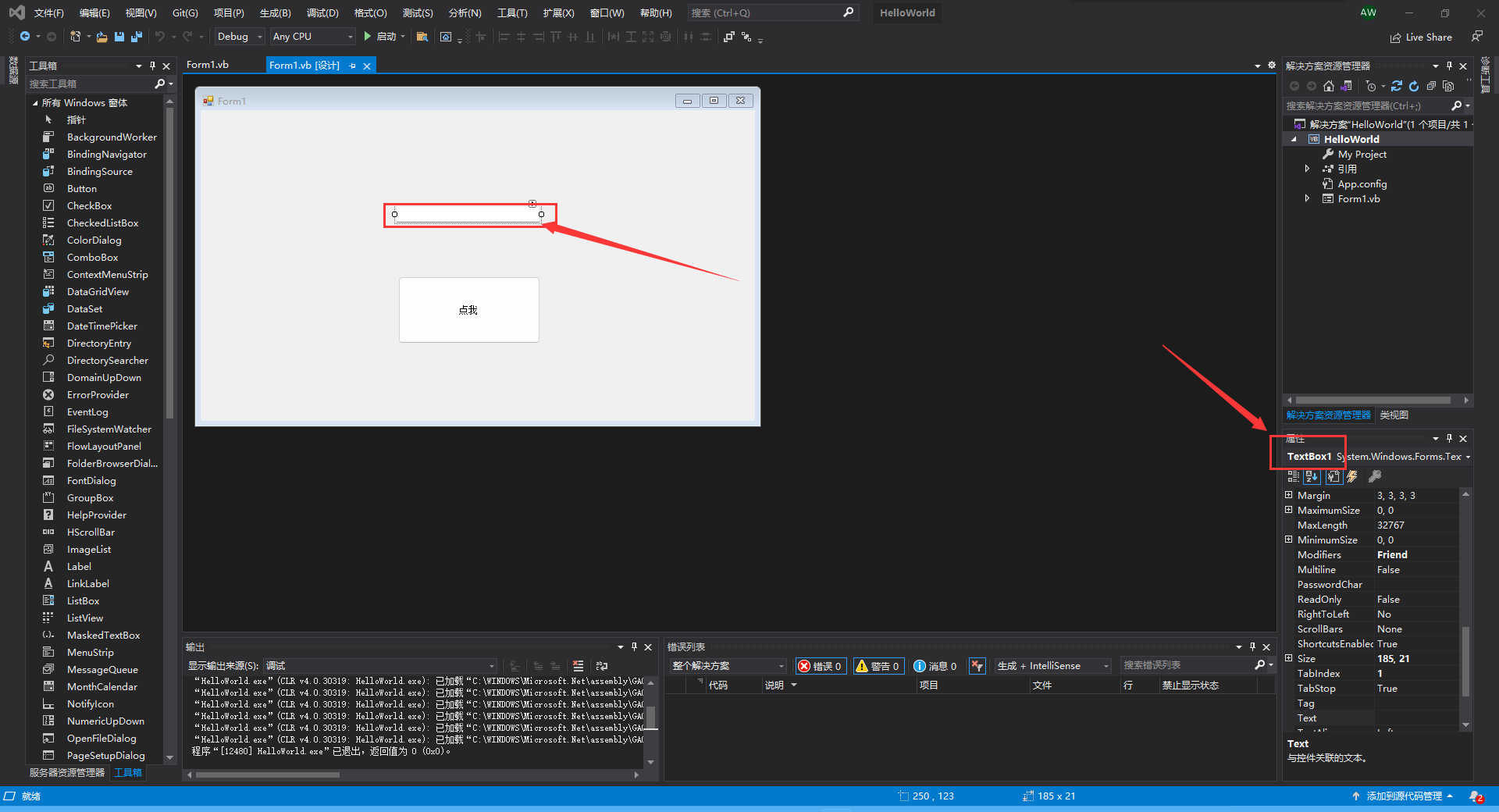 所以,回去看看吧,在上面的标签页中,点击Form1.vb[设计]*,回到刚才的设计界面。